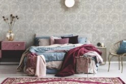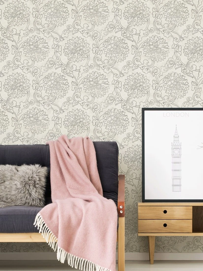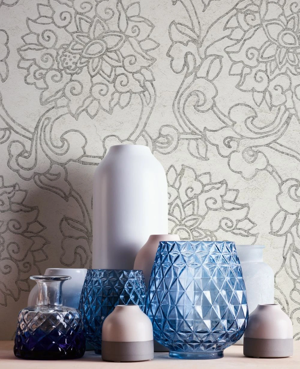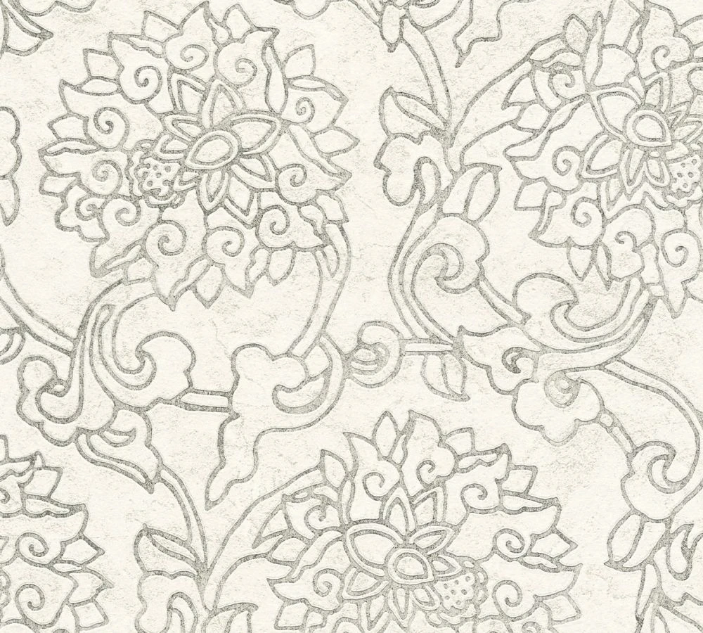 Amaya ist eine ausdrucksstarke Tapete, die mit einer zarten Farbzusammensetzung aus weiß und silber punkten kann. Sie ist dem chinesischen Wohnstil zuzuscheiben, jedoch die sanftere Variante und steht für Positivität und Ausgeglichenheit. Eine Besonderheit, ist die malerisch gezogene Linie, die ein großflächiges Blumenmotiv darstellt.