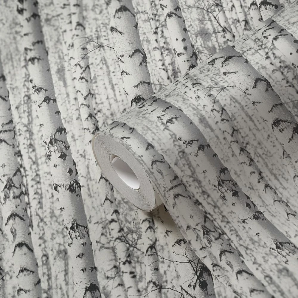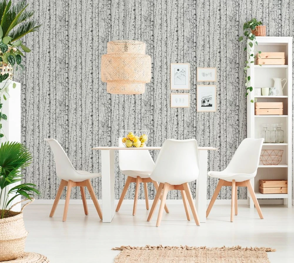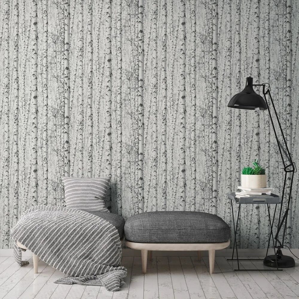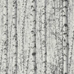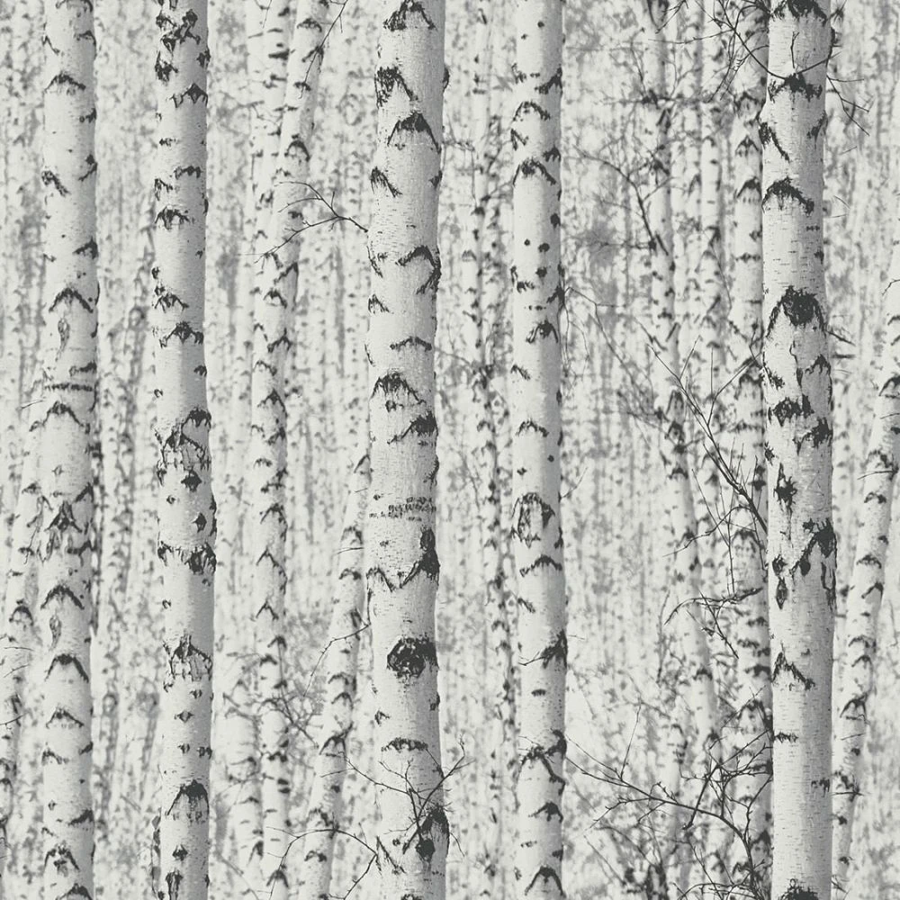 Ein mit zahlreichen Baumstämmen dicht bewachsener Birkenwald in 3D-Optik als Mustertapete für die Wand. Der schwarz weiße Digitaldruck auf Vliestapete erweitert Räumlichkeiten um einen neuen Horizont und sorgt für einen jungen, frischen Wohnlook.