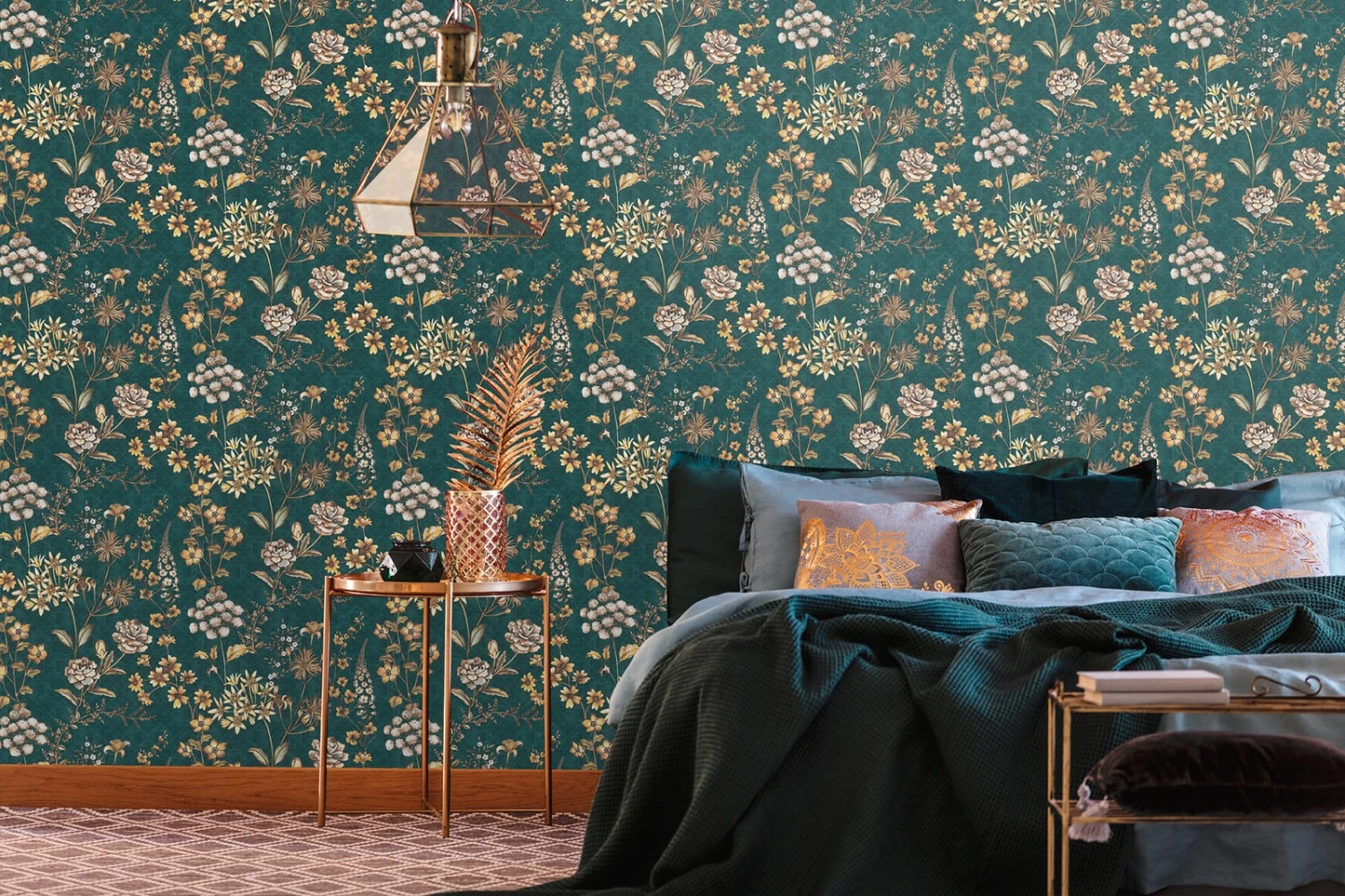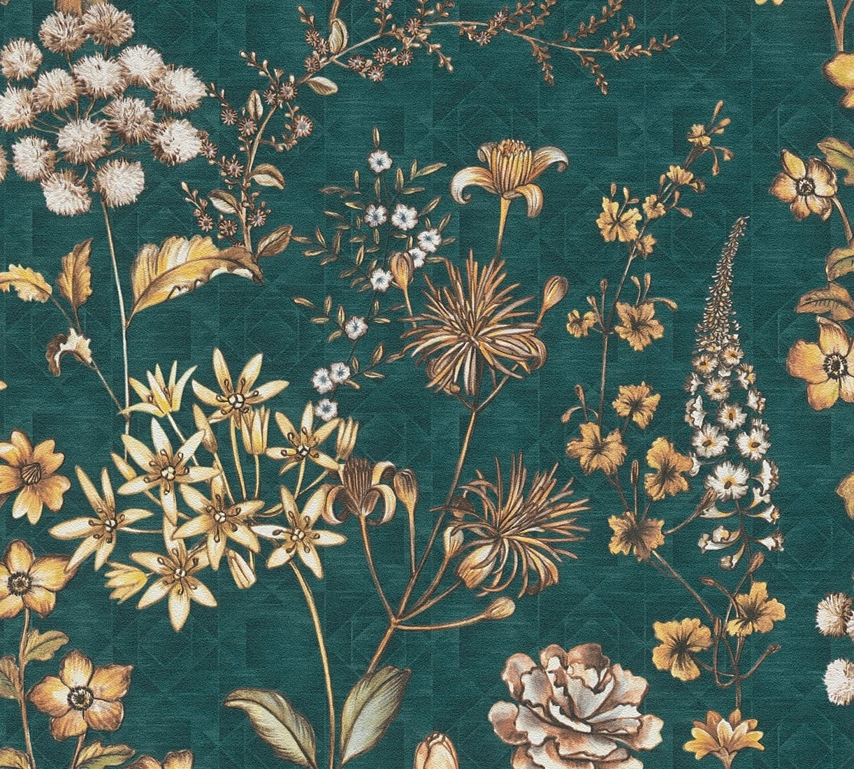 Als eine bohemian Vintagetapete im Landhausstil lässr sich die charmante florale Vliestapete Cecilia Petrol beschreiben: Beige, gelbe und cremefarbene Stroh- und Wiesenblumen schmücken die Tapete in der Trendfarbe Petrol. Die lockere Anordung der Blüten, Ranken und Blumen sowie die grafische Musterung des Untergrunds wirkt zufällig und verspielt. Ein Wohnaccessoire mit Vielfalt.