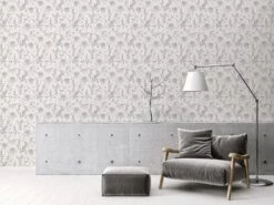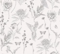 Die anmutige, florale Tapete Harper Weiß zeigt auf charmante Weise in der Art einer historischen Radierung oder eines Stichs lose angeordnete Wiesenblumen, Blattdekore, Schmetterlinge und Vogelmotive. Die monochrome, schwarz auf weiß gedruckte Mustertapete in leicht strukturierter Vliesqualität verleiht mit ihrem romantischem Dessin modernen Räumlichkeiten einen nostalgischen Touch.