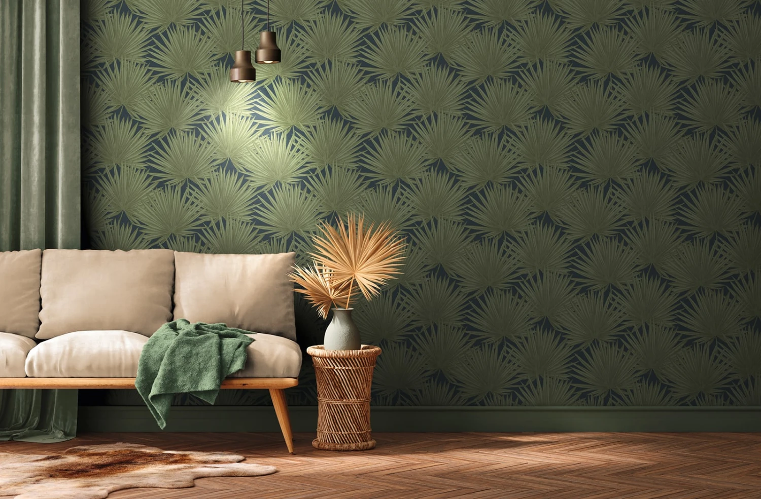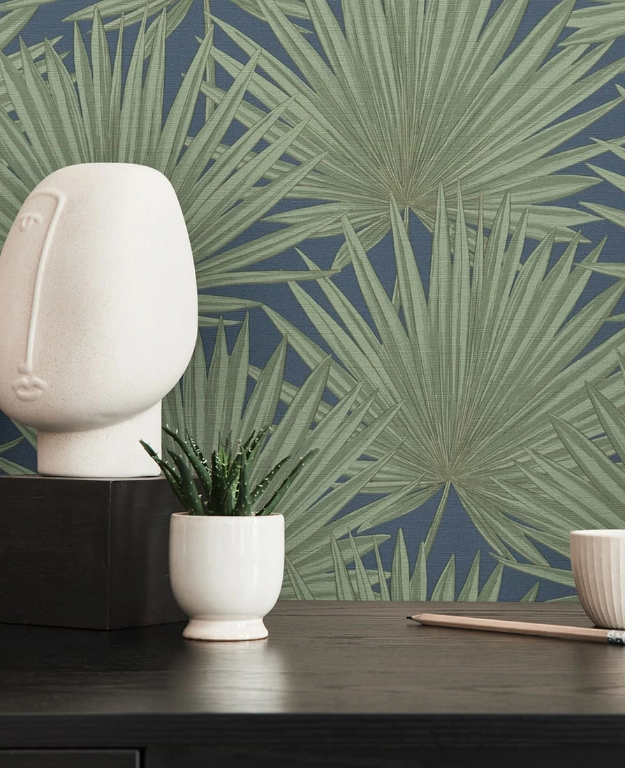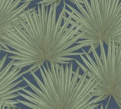 Die blau grüne Vliestapete Jamila Grün zeigt aufgefächerte Palmblätter in dekorativer Anordnung. Der Trend zu Dschungel- und Palmenmotiven bleibt weiterhin ungebrochen, die beliebten, exotischen floralen Mustertapeten verschönern und begrünen Wohn- und Arbeitsräume.