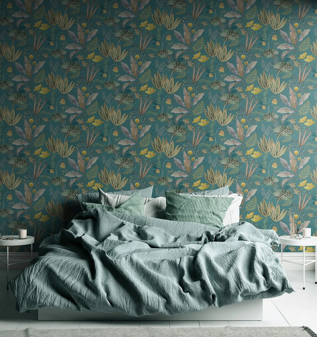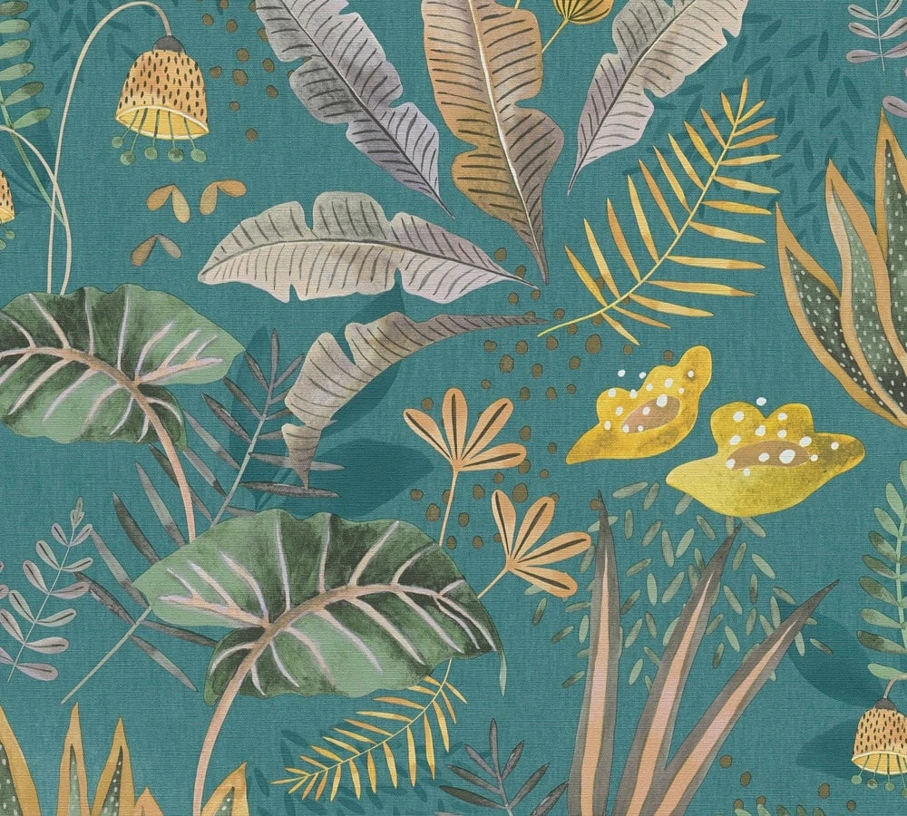 Die leicht strukturierte, florale Vliestapete Kenley Petrol zeigt satt türkis petrolfarbenem Tapetebgrund großzügig dargestellte, grüne und beige Blätter und Blüten, akzenturiert von okkergelben in Form von Blüten und zierlichen Zweigen. Mit ihrer kontrastreichen Farbkomposition in Gelb und Petrol sowie den charmant illustrierten Tapetenmotiven verleiht die Tapete Kenley Petrol Ihren Wänden ungezwungene Lebendigkeit.
