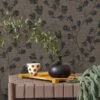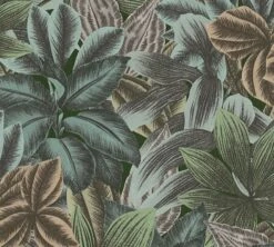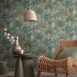 Ein opulenter Garten im tropischem Dschungelstyle, voller Palmenblätter und exotischer Pflanzen für die Wand, zeigt die Tapete Kiowa Grün in gedeckten Farbnuancen von Grün, Beige und Grau. Die schraffierten, schattierten Blätter sind leicht strukturiert und erschaffen eine schöne Räumlichkeit.