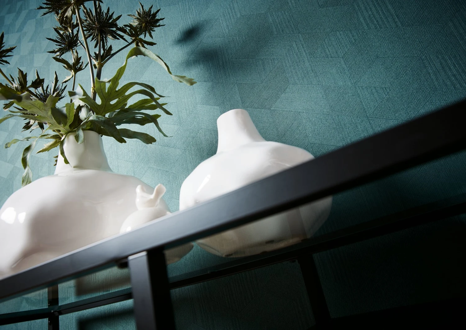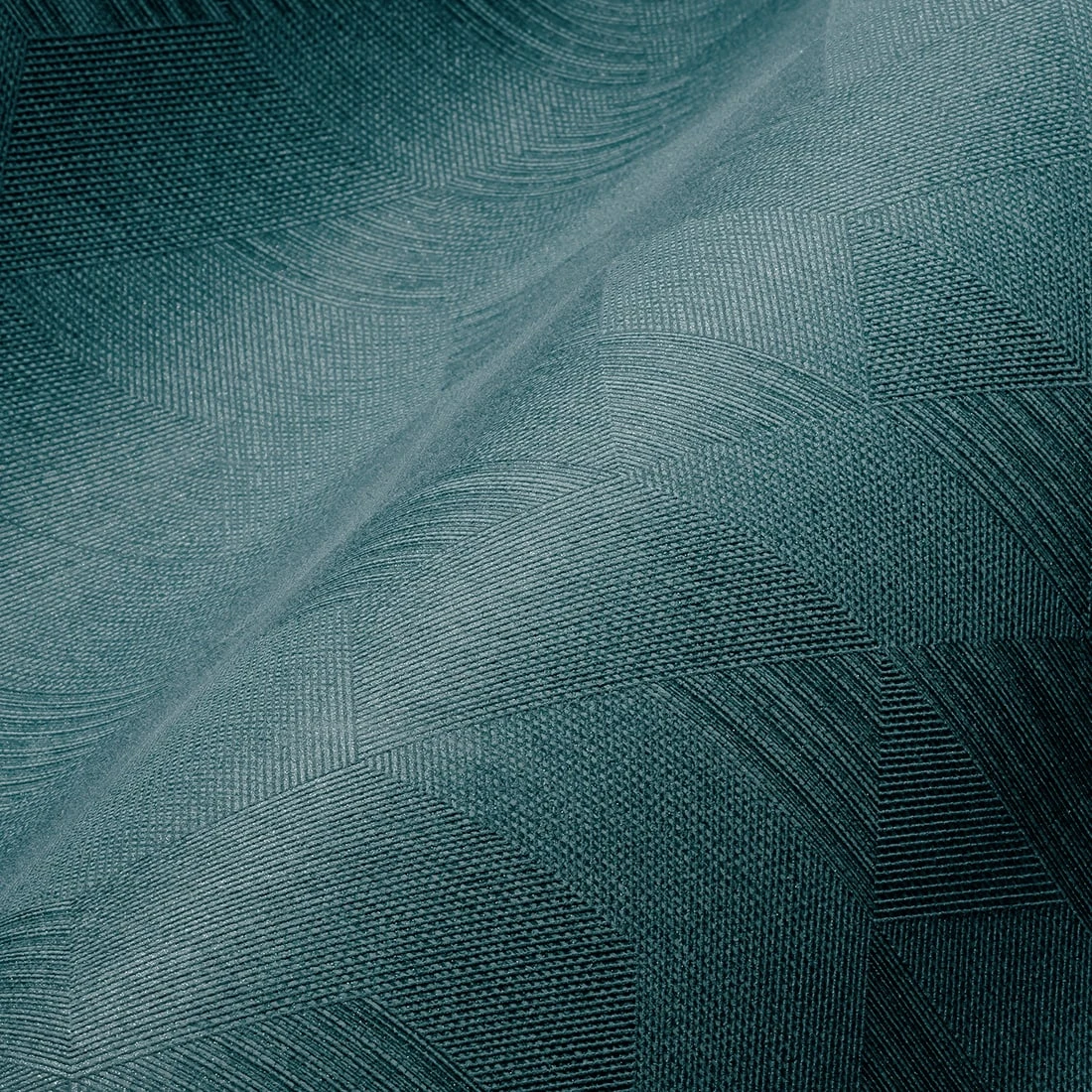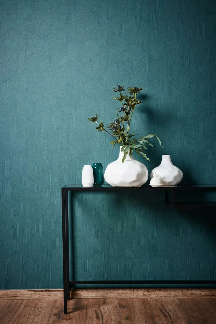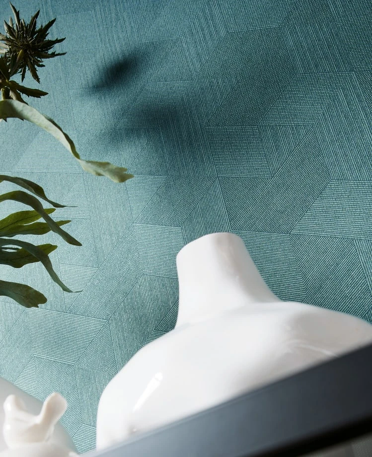 Die Tapete Prisma Petrol erschafft in ihrer feinen gemoetrisch streifigen Struktur eine gewebeartige Oberfläche in matter Optik, die dem Raum Tiefe verleiht. Die dominante Farbe Petrol schafft eine beruhigende Atmosphäre und setzt gleichzeitig einen kräftigen Akzent. Das geometrische Grafikmuster aus sich überlappenden Formen erzeugt eine dynamische Wirkung, die sich perfekt in zeitgemäße Interieurs einfügt.