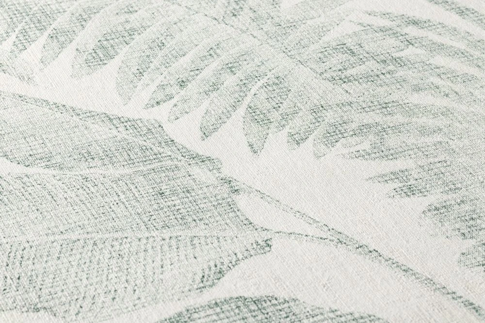 Tapete Soloy lässt natürliche Materialien wieder in den Vordergrund rücken. Hier zu sehen: eine Variation an Palmblättern, die mit einer feinen weißen Textur versehen ist und damit besonders ruhend wirkt. Ein wunderschöner Tapetenentwurf, der für eine moderne Ausstrahlung mit beruhigender Aura sorgt.