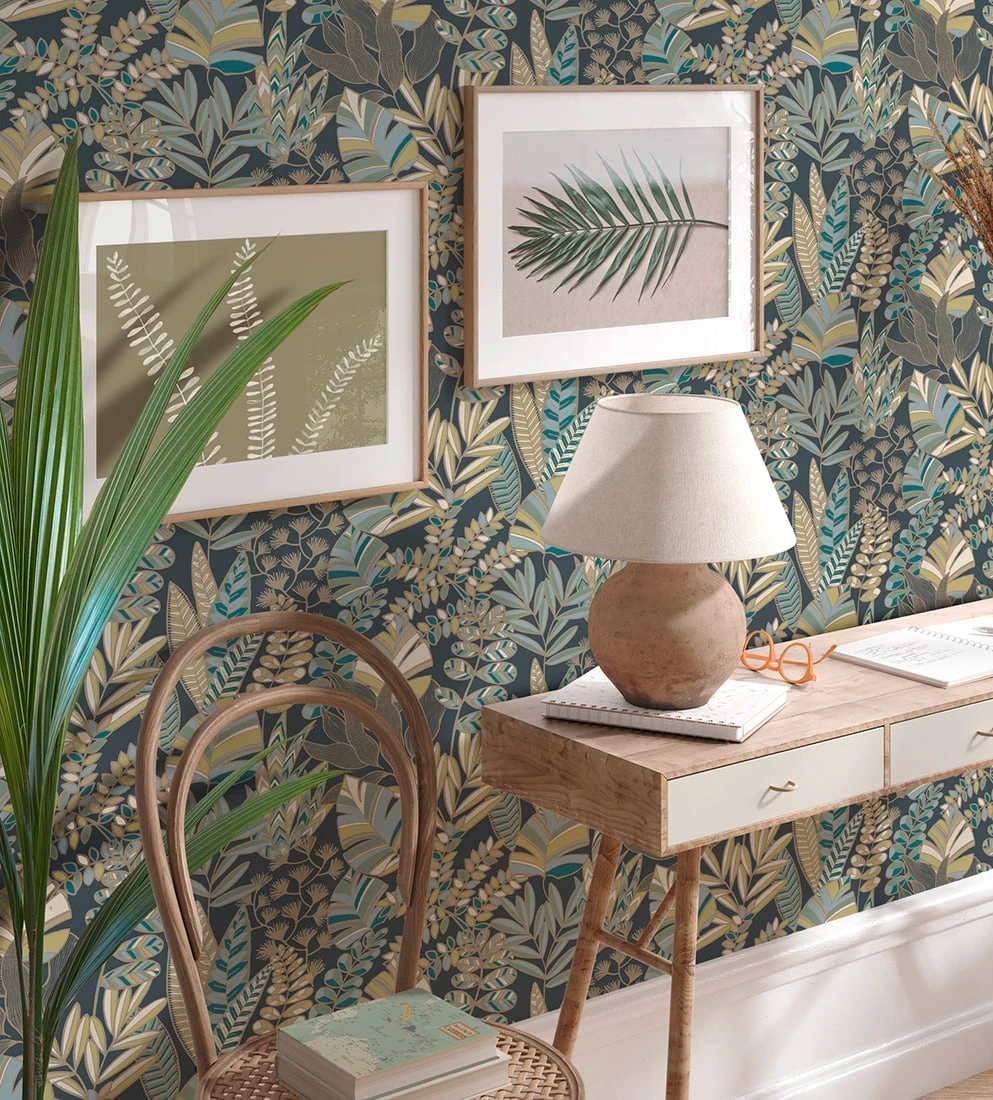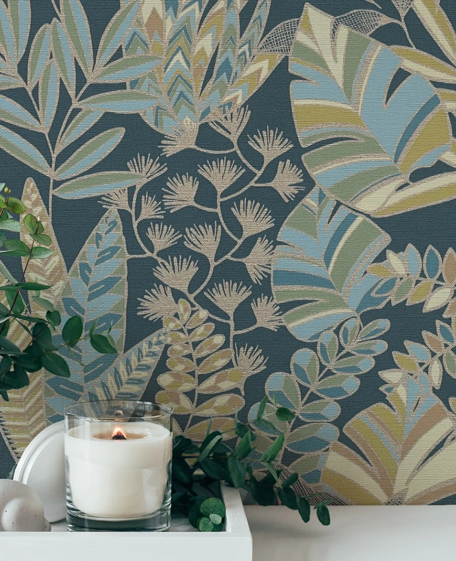 Blattwerk und Pflanzenmotive im Dschungelstil schmücken die geoflorale Vliestapete Sonia Blau. Zu dem nachtblauen Tapetengrund stehen die beige, helblau und grün gefärbten Blätter in einem harmonischen Hell-Dunkel-Kontrast. Metallische Highlights sorgen für glänzende Effekte.
