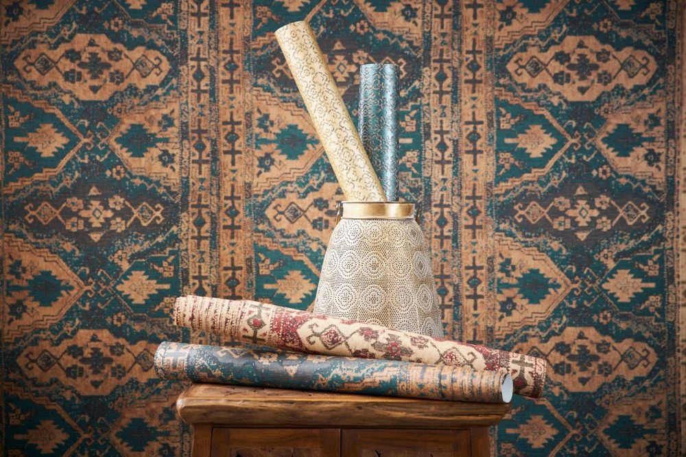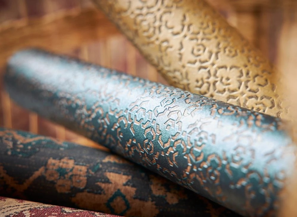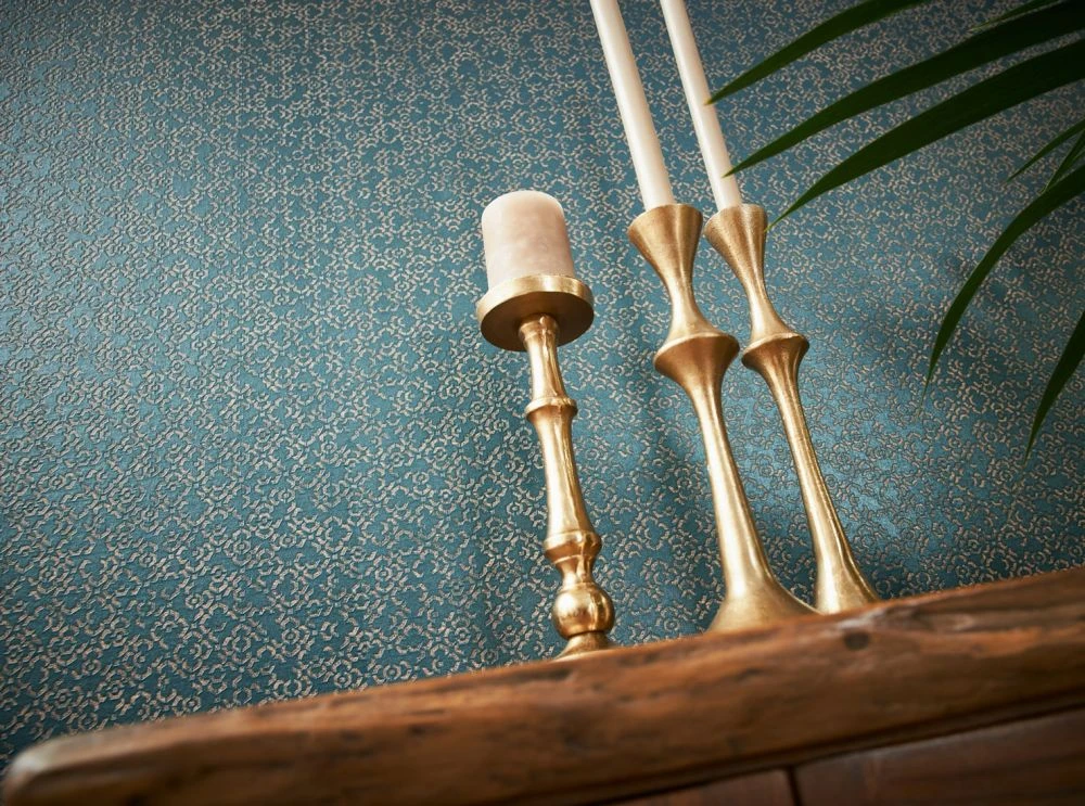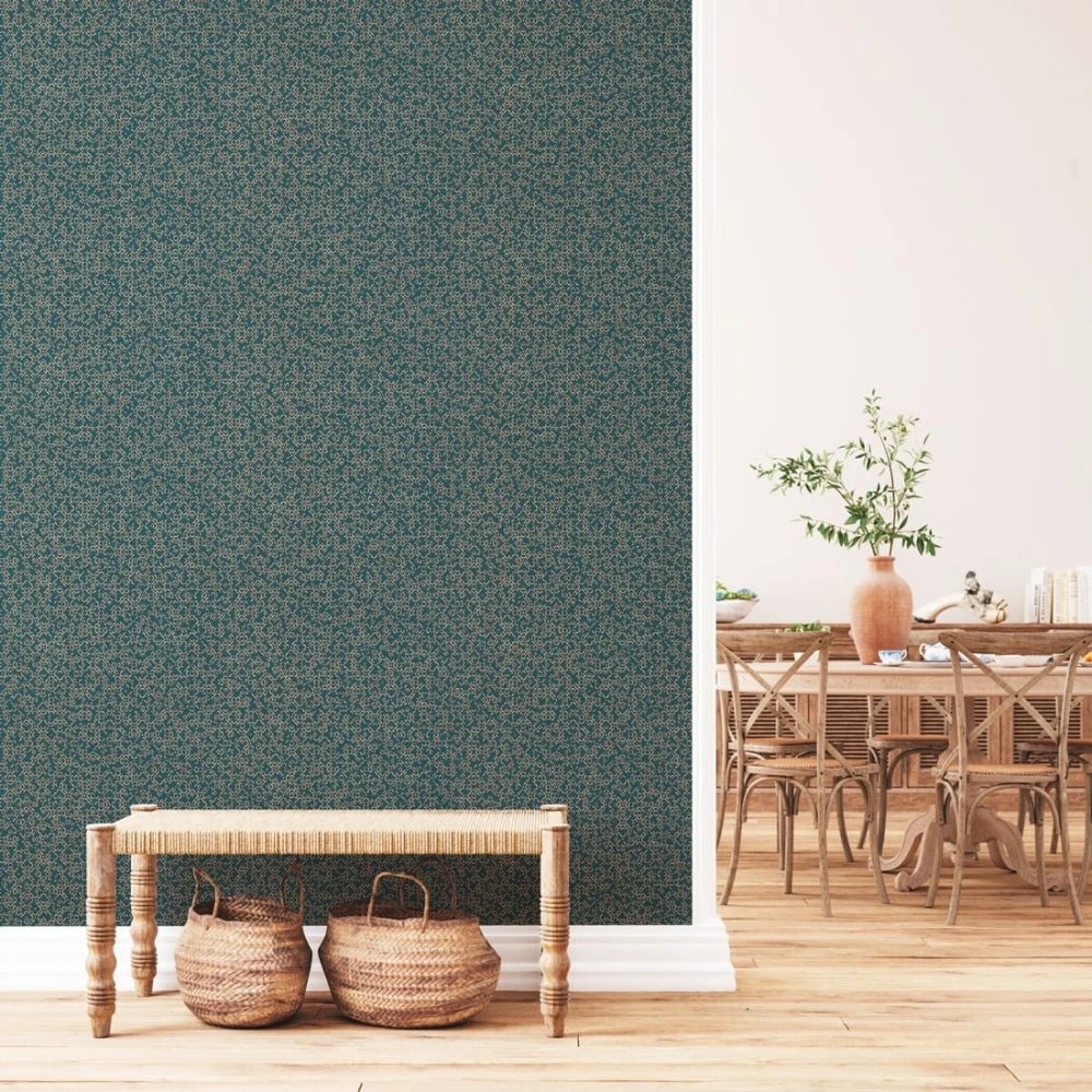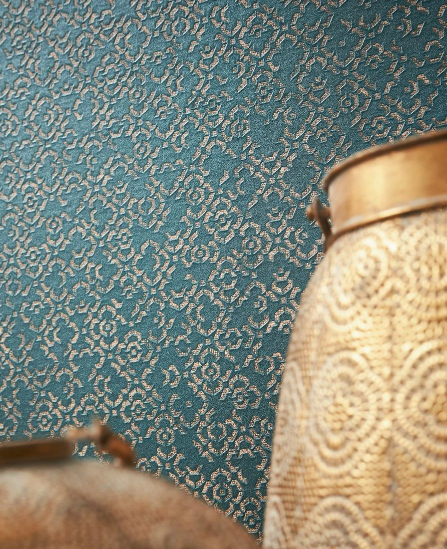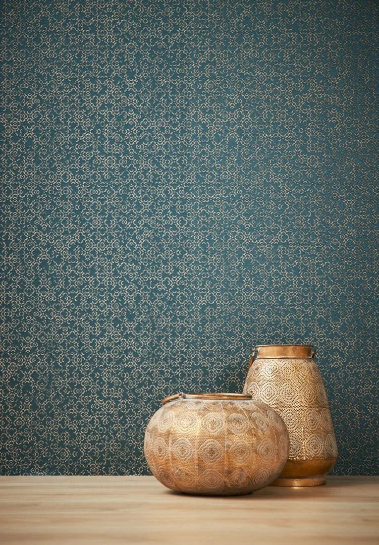 Tapete Tenali ist eine elgante und hochwertige Tapete mit orientalischen Flair. Die Struktur besteht aus ungleichmäßigen geometrischen Blümchen, die wie ein 3D Muster erscheinen. Verfügbar ist sie in der Farbe Gold und Blau-Petrol.