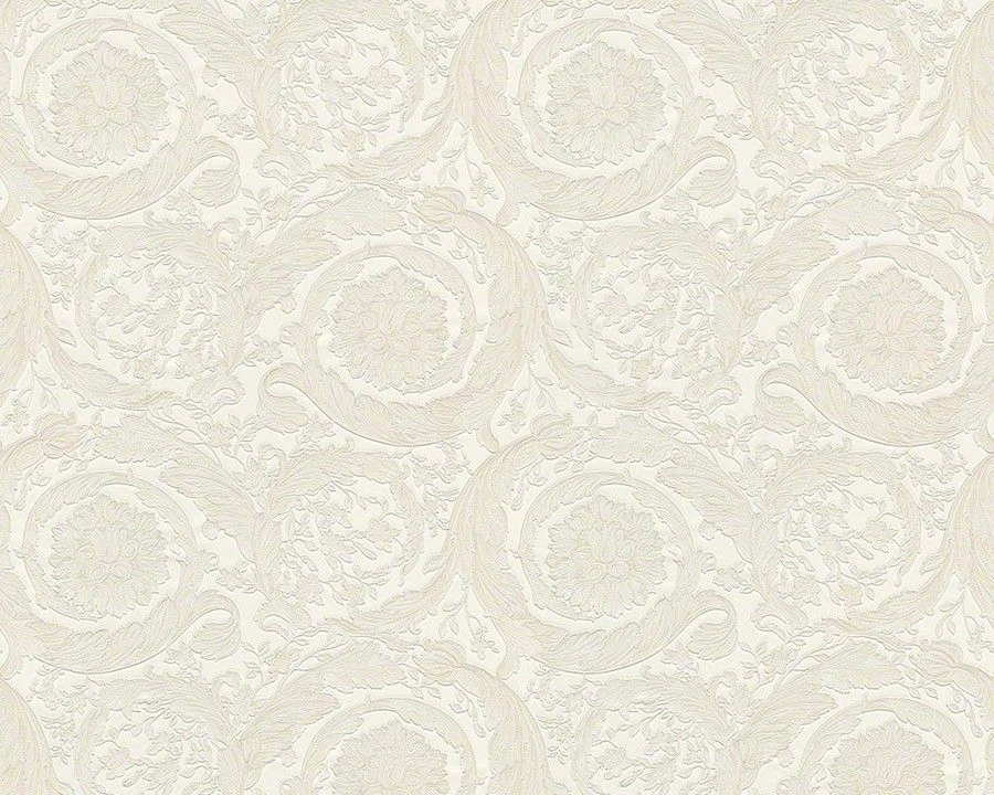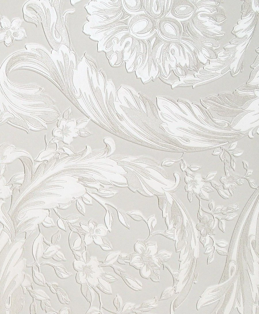 Barocke Einflüsse modisch umgesetzt: Versace ist berühmt und beliebt für Luxus und für das Spiel mit neobarocken und neoklassizistischen Motiven, das auch die Gestaltung dieser floralen, prächtigen Designertapete mit ihrem schimmernden Blüten und Balttdekor bestimmt.