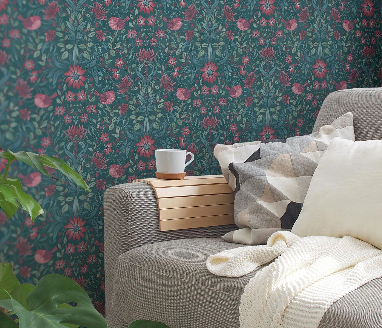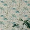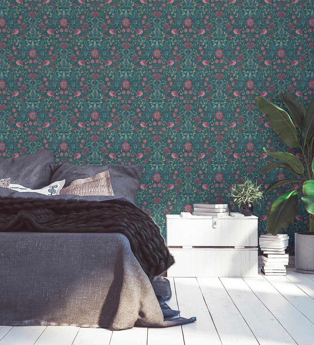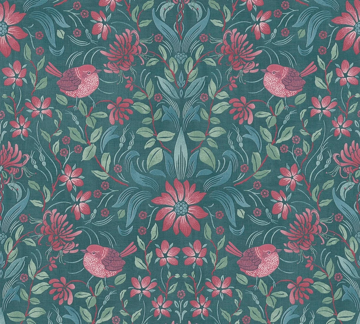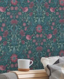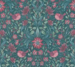 Florales Tapetenmotiv im Landhausstil, das in einer ausgeschmückten Ornamentik angelegt, auch Vögelchen zeigt. Die Farben schaffen in Petrol mit weiteren Grün- und Blautönen und Rosarot schöne Kontraste an der Wand.