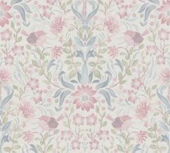Florales Tapetenmotiv im Landhausstil mit charmantem Vogeldekor. Das Tapetenmuster ist in einer ausgeschmückten Ornamentik angelegt, die an klassisches, britisches Tapetendesign erinnert. Das sanfte, helle Farbschema in weiß über Rosa, Hellblau und zartem Grün sorgt für eine romantische Wanddeko.