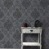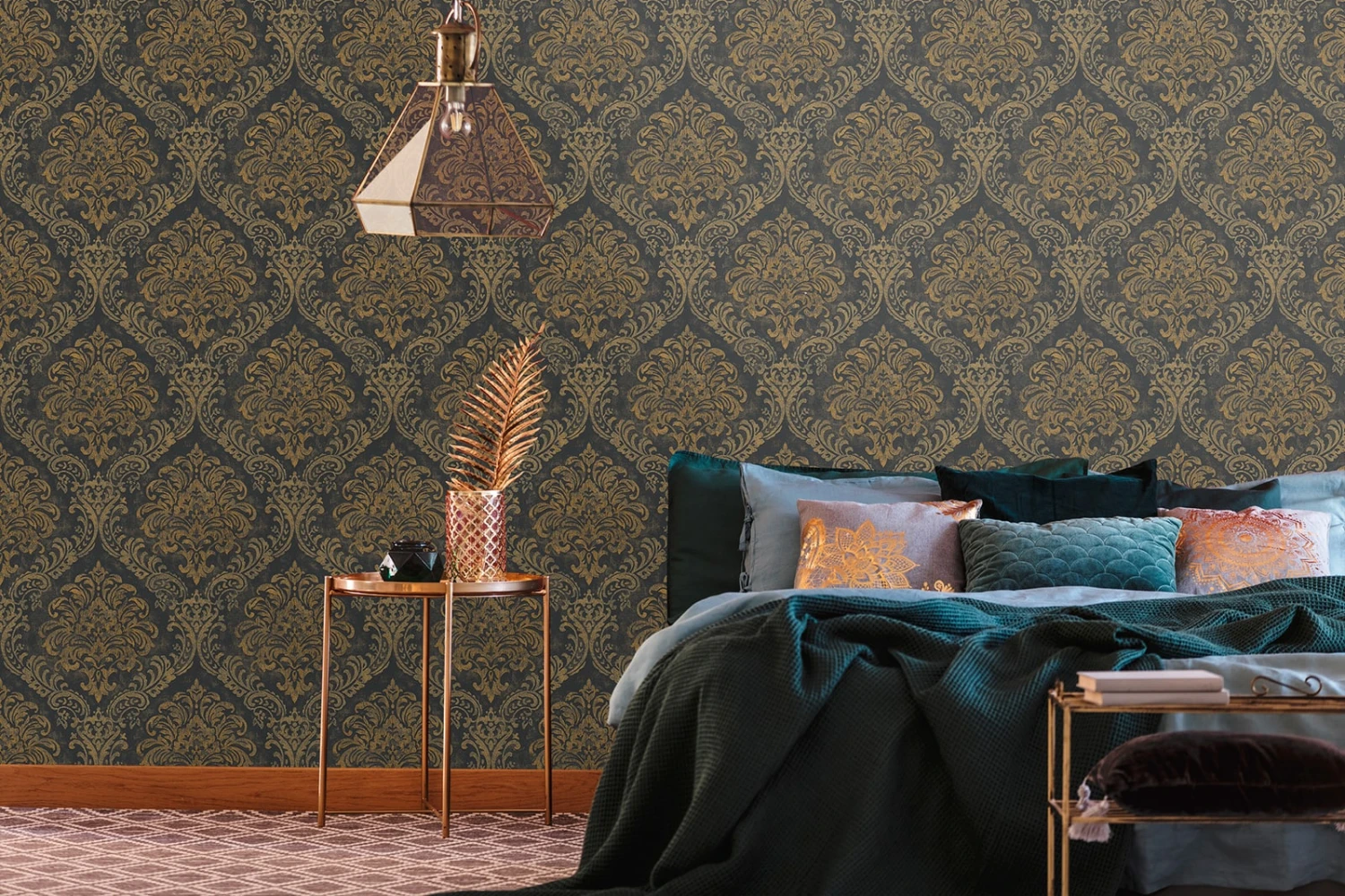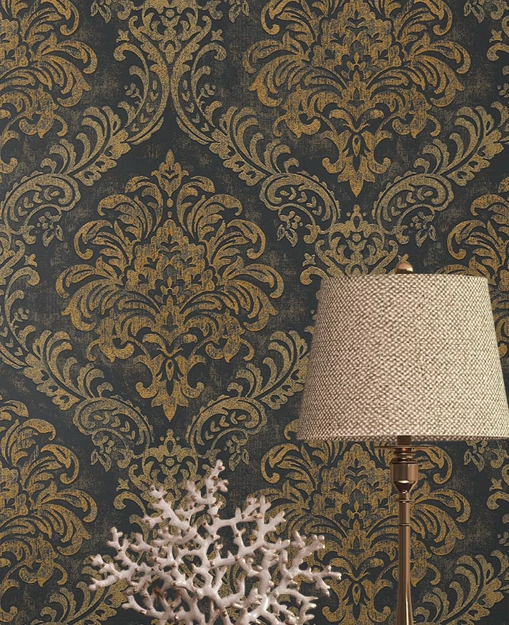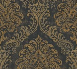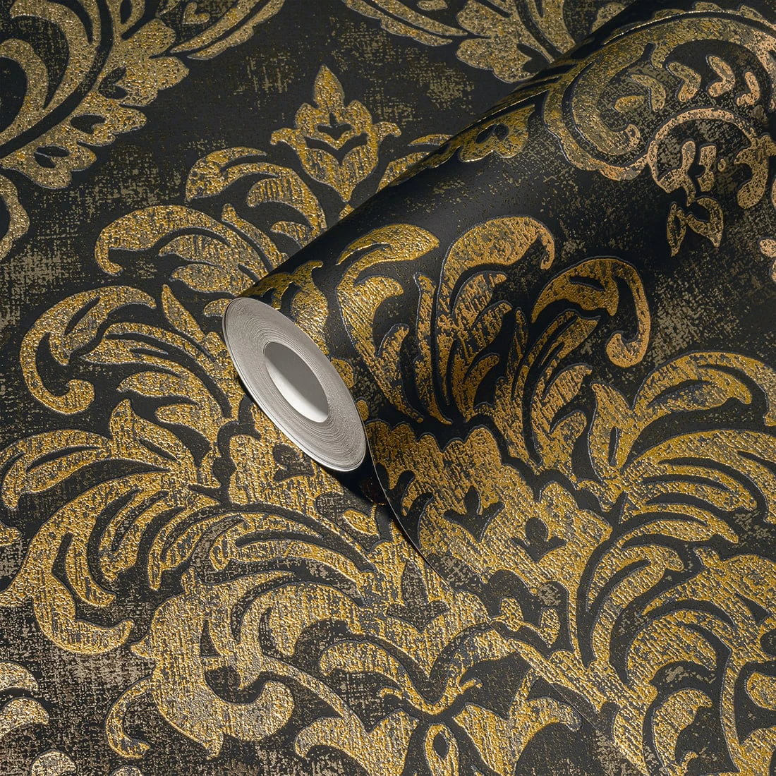 Klassisches Ornament im Kaffeehausstil in der zeitlos eleganten Farbkombination Gold auf Anthrazit. So edel und antik das patinierte Tapetenmuster auch wirken mag, es handelt sich um eine moderne Vinyl-auf-Vliestapete mit den besten Eigenschaften wie guter Lichtbeständigkeit und Scheuerbeständigkeit, die auch aufgrund des geraden Ansatzes gut zu verarbeiten ist.