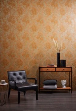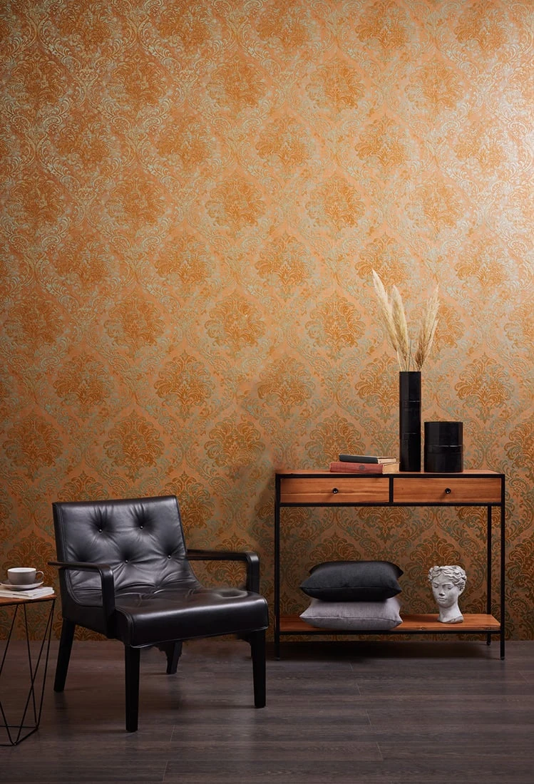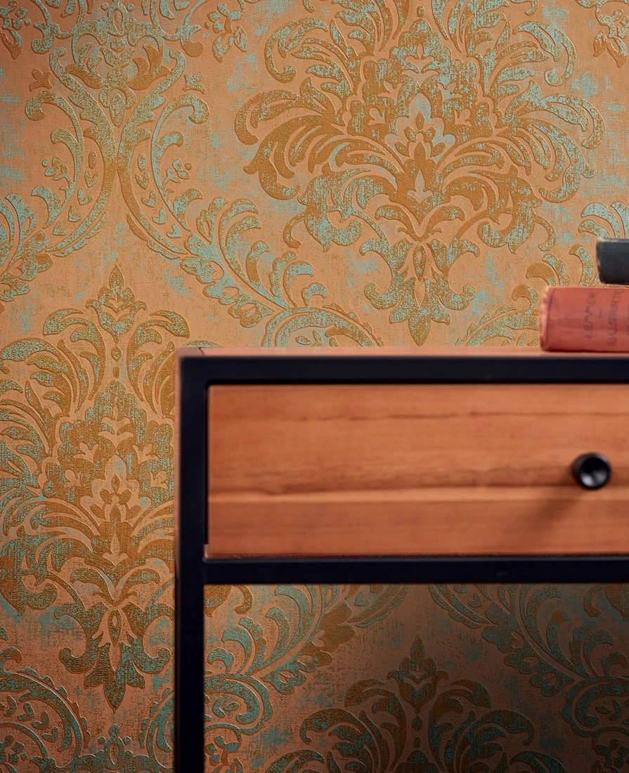 Klassisches Ornament im Kaffeehausstil in der zeitlos eleganten Farbkombination Türkis auf Gold. So edel und antik das patinierte Tapetenmuster auch wirken mag, es handelt sich um eine moderne Vinyl-auf-Vliestapete mit den besten Eigenschaften wie guter Lichtbeständigkeit und Scheuerbeständigkeit, die auch aufgrund des geraden Ansatzes gut zu verarbeiten ist.